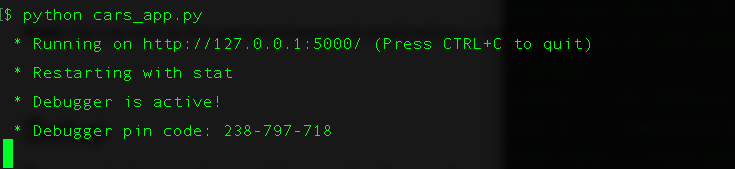 This section lists the API endpoints present. It also lists the call you would make with Python's requests library. To follow along, please run python cars_app.py in one terminal prompt. Then, in a new terminal prompt, pull up your Python interpreter (by typing python) and import requests. Then, follow along by running the commands below in your Python interpreter.